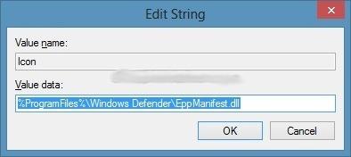 Pasul 4: Click pe nou key creat WindowsDefender, in partea dreapta creem un String Value numit Icon si setam %ProgramFiles%\\Windows Defender\\EppManifest.dll ca valoare.