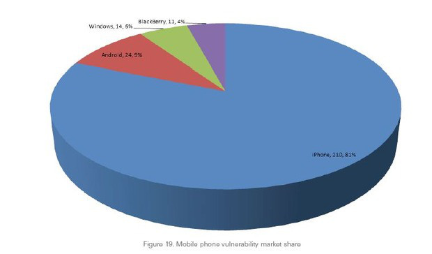 Conform unui studiu realizat de catre SourceFire s-au găsit 210 vulnerabilităţi în iPhone, ceea ce înseamnă mai bine de 81% cota de vulnerabilitate în domeniul smartphonurilor, pe când Android, Windows Phone şi BlackBerry au toate trei la un loc 19%.